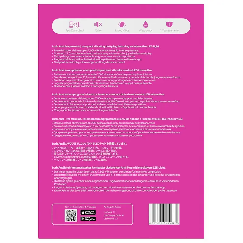 Lush Anal vibro-plug od Lovense pruža intenzivno i uzbudljivo iskustvo analne stimulacije, kombinujući moćne vibracije sa spektakularnim svetlosnim efektima. Dizajniran za sigurnu i udobnu upotrebu, ovaj plug je izrađen od svilenkasto glatkog silikona, što omogućava jednostavno umetanje i savršeno prijanjanje tokom svake aktivnosti. Njegov konusni oblik i blago zakrivljena baza obezbeđuju stabilno držanje u anusu, dok fleksibilnost materijala garantuje udobnost i optimalno prilagođavanje telu. Lush Anal vibro-plug može da dostigne do 7.500 vibracija u minuti, ali ostaje izuzetno tih i diskretan sa nivoom buke od samo 33 dB. Njegov LED sistem svetala u različitim bojama pulsira u ritmu vibracija, stvarajući pravu svetlosnu predstavu koja dodatno pojačava užitak i vizuelni doživljaj igre u mraku ili tokom online sesija sa partnerom. Vibro-plug se kontroliše putem Lovense aplikacije preko Bluetooth-a, omogućavajući kreiranje i čuvanje personalizovanih vibracionih programa. Partneri mogu daljinski preuzeti kontrolu, što čini igru uzbudljivom čak i na daljinu. Pored aplikacije, vibracije se mogu aktivirati i putem zvuka, sinhronizujući se sa muzikom ili video sadržajem, dok je direktna kontrola moguća preko dugmeta na spoljašnjoj površini igračke. Lush Anal je punjiv i dolazi sa USB kablom, a baterija traje do 4 sata neprekidne stimulacije. Dimenzije: ukupna dužina 9,8 cm, dužina za umetanje 6,9 cm, maksimalni prečnik 2,15 cm, težina 55 g. Ovaj plug je savršen spoj tehnologije, udobnosti i uzbuđenja, idealan za sve koji žele da istraže analne užitke sa stilom i inovativnim svetlosnim efektima.Video proizvoda